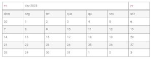 << dez 2025 >> dom seg ter qua qui sex sáb 30 1 2 3 4 5 6 7 8 9 10 11 12 13